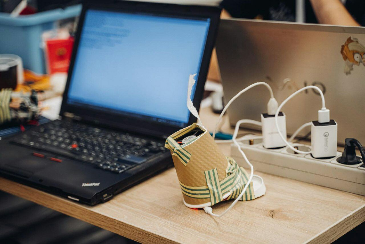 Времени было мало: Артём писал логику системы на питоне, Валера паял контакты и пытался подружить систему с датчиками, я как мог описывал фичи. Сделали работающий прототип, в качестве вентилятора подключили кулер, дующий на салфетку.
